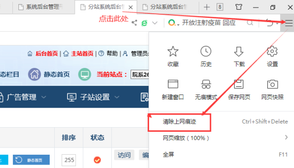 以360為列,清理緩存的方法,點擊360瀏覽器的右上角-----碘酒清除上網痕跡