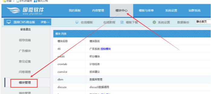 2、解決方法是:進(jìn)入系統(tǒng)后臺----模塊中心