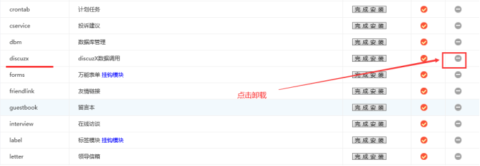 3、找到discuzx論壇數(shù)據(jù)調(diào)用模塊,點(diǎn)擊灰色按鈕,點(diǎn)擊卸載