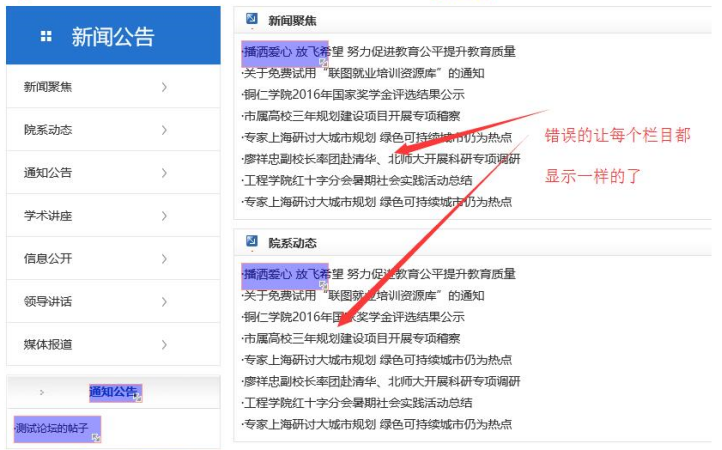 如果我們打開大分類,發現里面的內容都一樣 ,如何處理呢? 一般都是大分類的動態標簽沒有選擇。