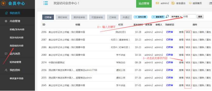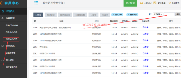 在“我發(fā)布的內(nèi)容”、”我簽核的內(nèi)容”里面,輸入內(nèi)容關(guān)鍵字、內(nèi)容ID,即可搜索出所需內(nèi)容。