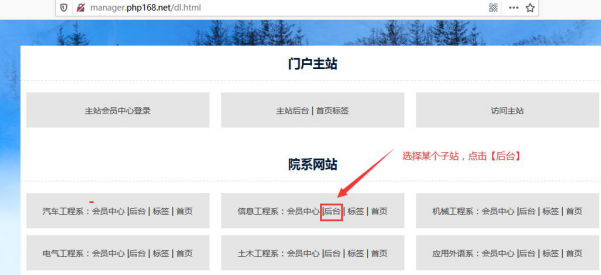 打開統(tǒng)一登錄網(wǎng)址,選擇各自的子站,點(diǎn)擊進(jìn)入該子站后臺(tái)