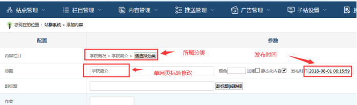 A:下面對(duì)單網(wǎng)頁標(biāo)題、所屬欄目、發(fā)布時(shí)間進(jìn)行修改
