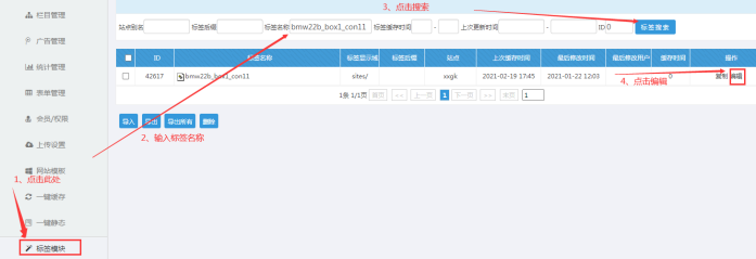 進入網(wǎng)站后臺----點擊【標簽模塊】----輸入標簽名字-----點擊標簽搜索------點擊編輯的標簽即可: