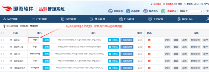 那么這個站點名字如何查找呢,在站群后臺-----看到本站點的別名即可: