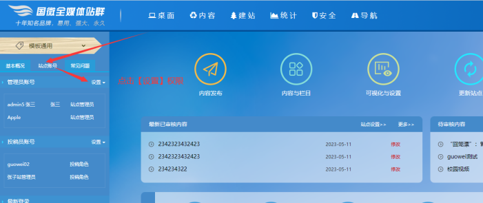 在后臺初始頁,鼠標點擊【站點賬號】-----點擊【設(shè)置】