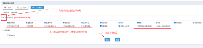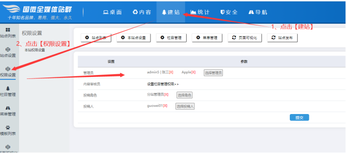 說明:分站管理員可以設(shè)置本站【投稿員】權(quán)限。其他操作只能是超管或特定權(quán)限的人才可操作。