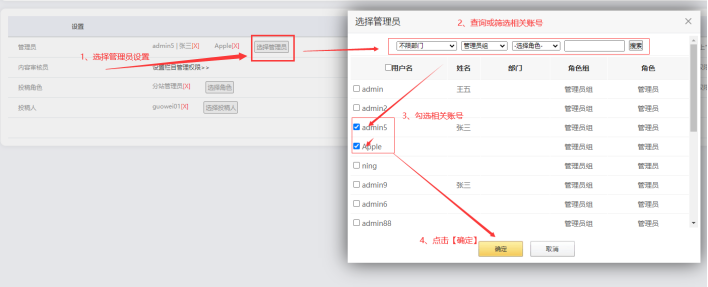 說明:關(guān)鍵字搜索框中,可以輸入“用戶名”或“姓名”都可以同時搜索相關(guān)賬號。另外還可以按部門與角色篩選,快速選擇相關(guān)管理員。