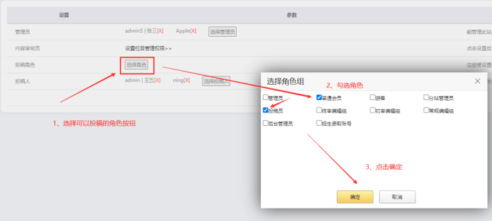 【投稿角色】設(shè)置,可以設(shè)置某個或多個角色擁有本站的投稿權(quán)限。每個【角色】下面有很多賬號,相當于就是快速批量授予權(quán)限。這種情況用的比較少,因為一般網(wǎng)站允許投稿的人數(shù)量不多。當然如果要啟用這個應用,需要事先將角色體系設(shè)置科學合理,方便此處設(shè)置產(chǎn)生良好效果。