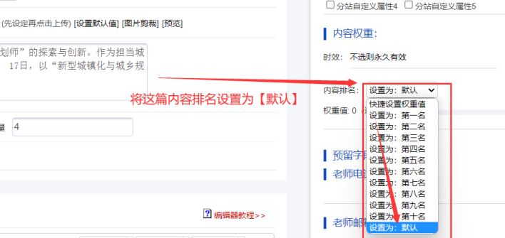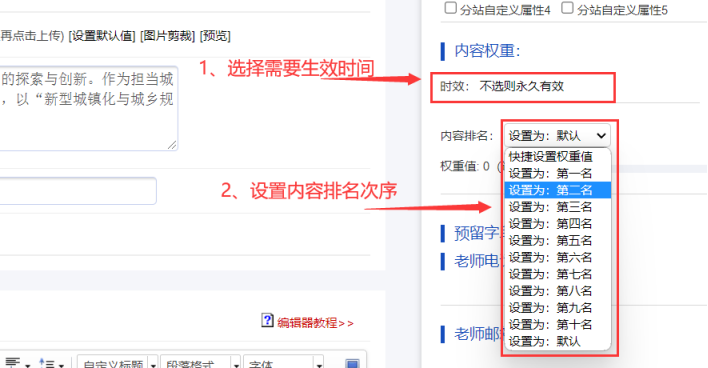 設置該內容的置頂位置,比如【第一名】【第二名】,如果選擇【默認】,則恢復到不置頂的默認狀態。【時效】也可以設置就是置頂有效期,不設置時間就是永久有效,直至手工取消。