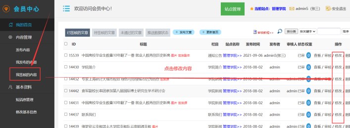 進入各個子站點后臺----點擊【內容】按鈕-----點擊【內容管理】: