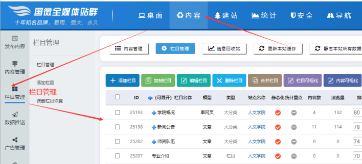 C、點(diǎn)擊【內(nèi)容】---【欄目管理】,可以進(jìn)入欄目管理界面