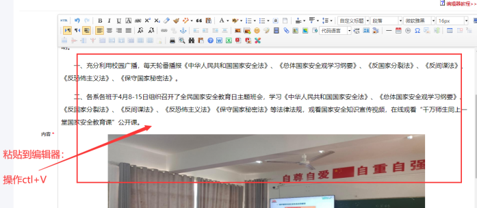 A、打開相關(guān)內(nèi)容,wps和docx等其他格式文檔均可,全選并復(fù)制相關(guān)內(nèi)容;然后打開網(wǎng)站發(fā)布內(nèi)容,直接將上面內(nèi)容粘貼(只能用ctl+V的粘貼方式)到編輯器里面: