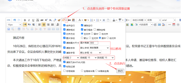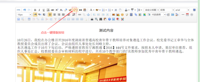 為了讓網(wǎng)站內(nèi)容稿件格式正確,直接點(diǎn)擊【一鍵排版】按鈕即可,一鍵排版的初始化格式由宣傳部提供。