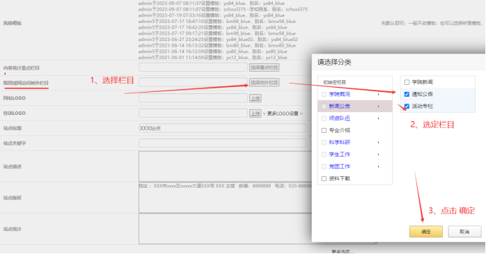 接著,點(diǎn)擊【選擇例外欄目】按鈕--------勾選需要例外放開(kāi)的欄目(可以多選)----點(diǎn)擊【確定】: