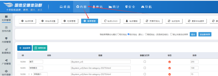 A、點擊【內容】---【菜單管理】,可以進入菜單管理界面