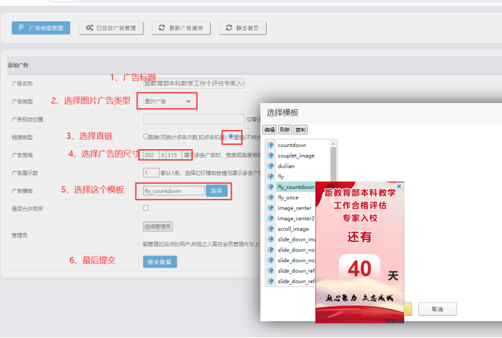 上傳所需的漂浮背景圖圖片、加上圖片鏈接、通過審核和顯示都要打鉤,特別是那個有效期,就是倒計時為止的時間,按這個計算天數,最后點擊提交