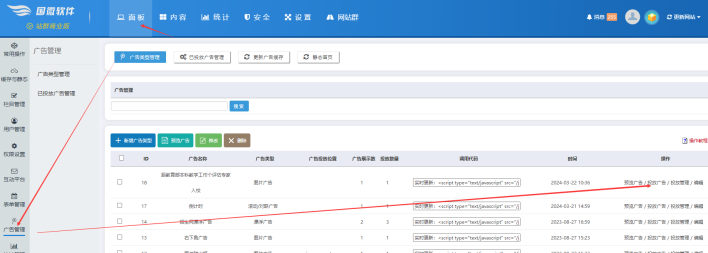 1、進入后臺---點擊面板---廣告管理----點擊新增廣告類型