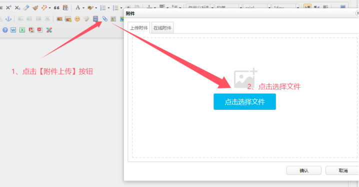 A、點擊【附件上傳】按鈕-----在彈出框中,選擇【點擊選擇文件】---并選擇好所需附件