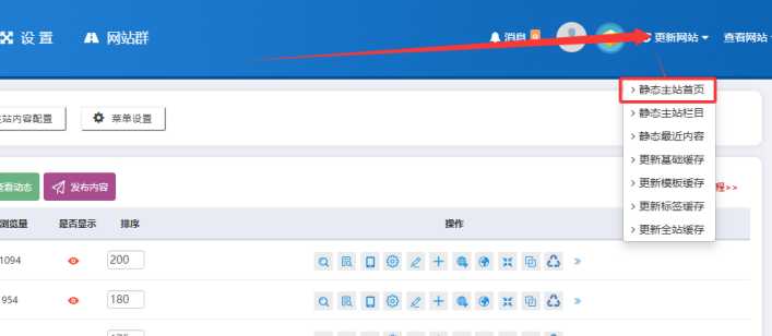進(jìn)入本站后臺(tái)------鼠標(biāo)放在【更新網(wǎng)站】按鈕上--------點(diǎn)擊【靜態(tài)本站首頁(yè)】: