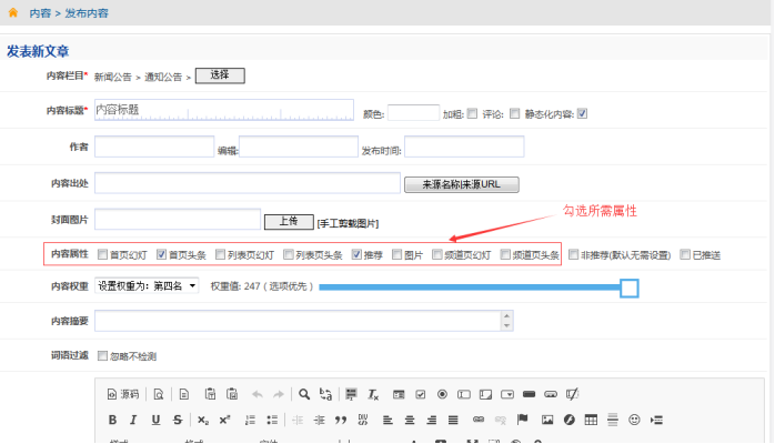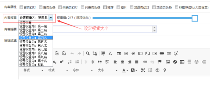 內容屬性:根據屬性來讓內容顯示的位置 權重:如果讓某條內容一直置頂顯示,就可以用權重