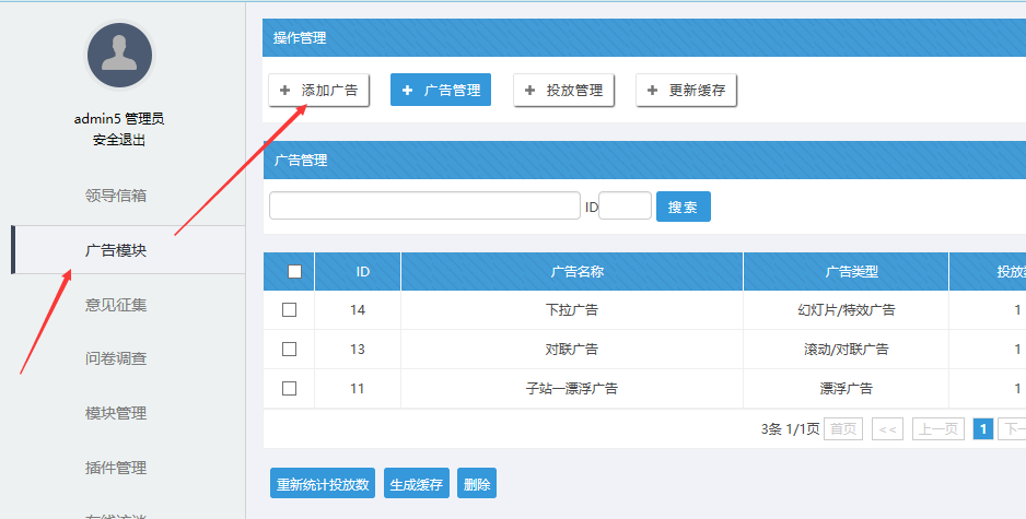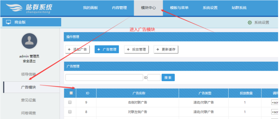 模塊中心----廣告模塊-----點擊“添加廣告” (準備創建對聯廣告為列)