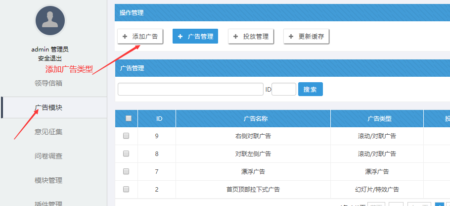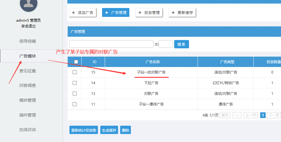 備注:上面的步驟做好后,該子站管理員,在站群后臺-----點擊廣告管理------可以看到對應的廣告類型------然后投放廣告進行預覽--------然后將所需調用的廣告類型js,放到子站首頁底部標簽(一次即可)--------最后更新緩存,靜態首頁刷新即可看到效果。