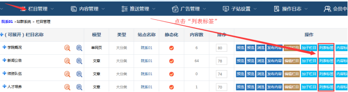 站群后臺---點擊欄目管理-----點擊“列表標簽”