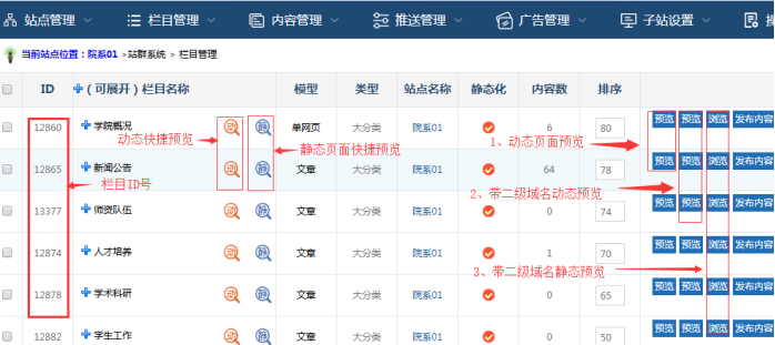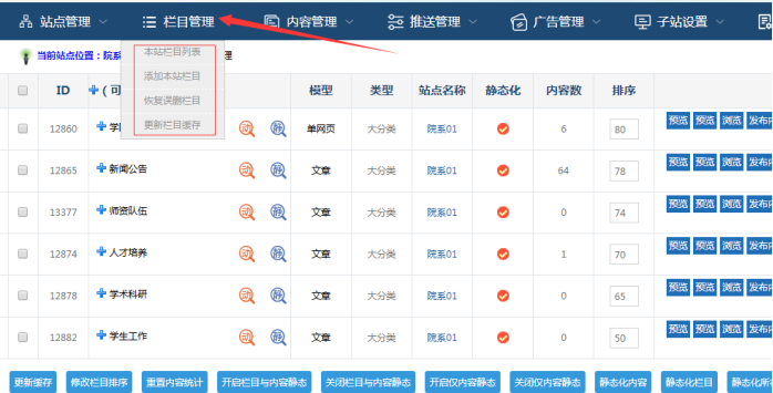進入子站站群后臺-----點擊欄目管理-----欄目管理的下拉菜單可以仔細看看