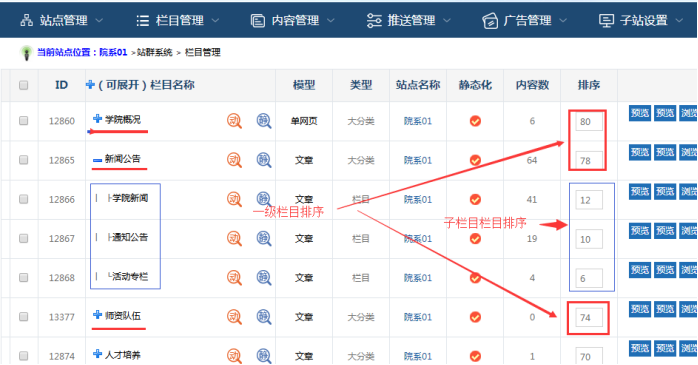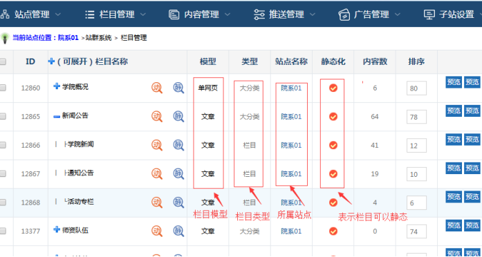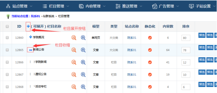 每個站點的管理員,都可以管理自己的欄目;欄目管理是網站運行中,做重要的功能和工作