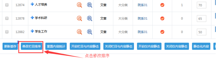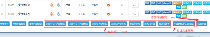 A:底部的靜態化按鈕、欄目批量刪除按鈕、添加欄目按鈕、重置內容統計按鈕。