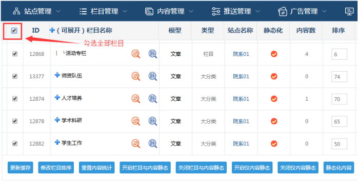 A:點擊此處勾選,就是全選所有欄目,然后點擊可以下面的功能(比如靜態操作)。