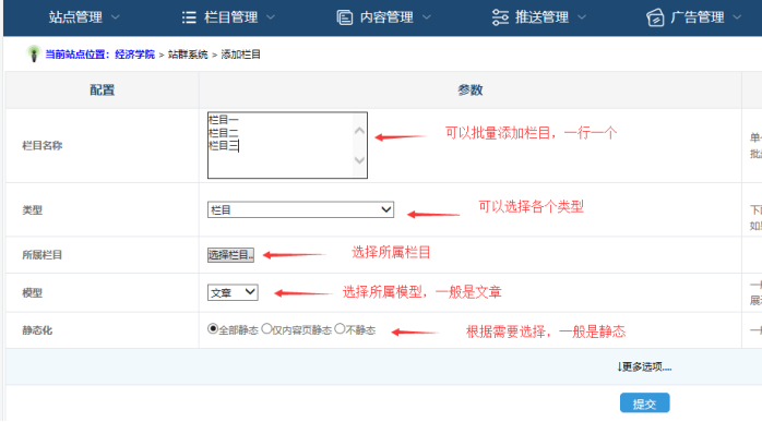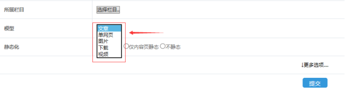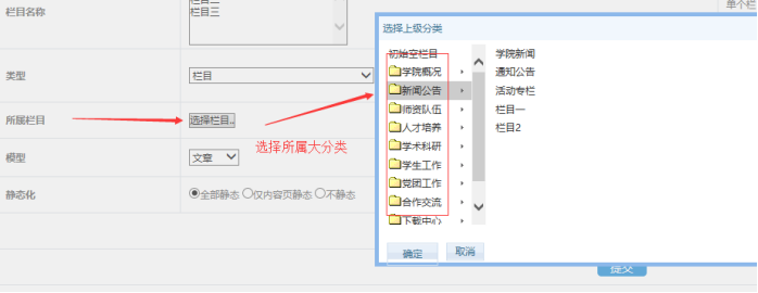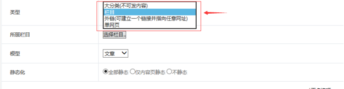 下面根據(jù)需要選擇“欄目類型”、“所屬欄目”、“欄目模型”、“靜態(tài)化”