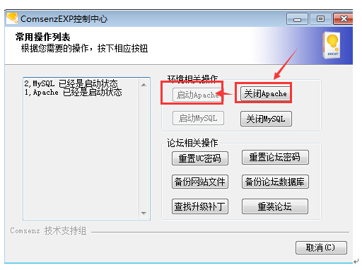 設置完后,必須要 重啟apache,域名設置才能生效;桌面打開discuz套件的快捷按鈕,彈出此界面,先關閉apache,然后在點擊啟動即可。