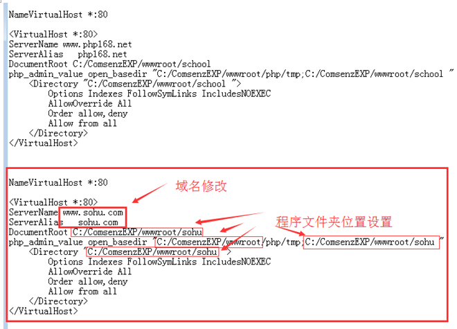 B:同樣在httpd-vhosts.conf文件夾中,我們復制一段出來,改下對應的域名和文件夾對應位置。就可以了;然后重啟apache就生效了。 舉一反三,如果再新增一個網站,你再復制一段,然后改下即可。