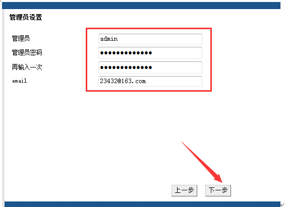 設置管理員賬號和密碼;密碼必須8位,數字+英文;然后點擊下一步