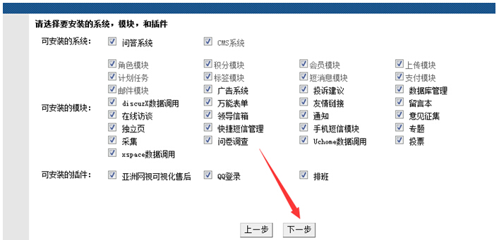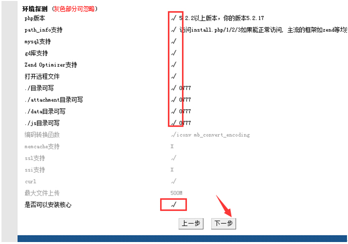 出現相關的安裝環境提示,深黑色的地方必須打鉤才能安裝,如果里面 任意一項不支持,就會提示核心無法安裝,從而無法安裝網站。淺灰色的是可選的,不一定要支持。